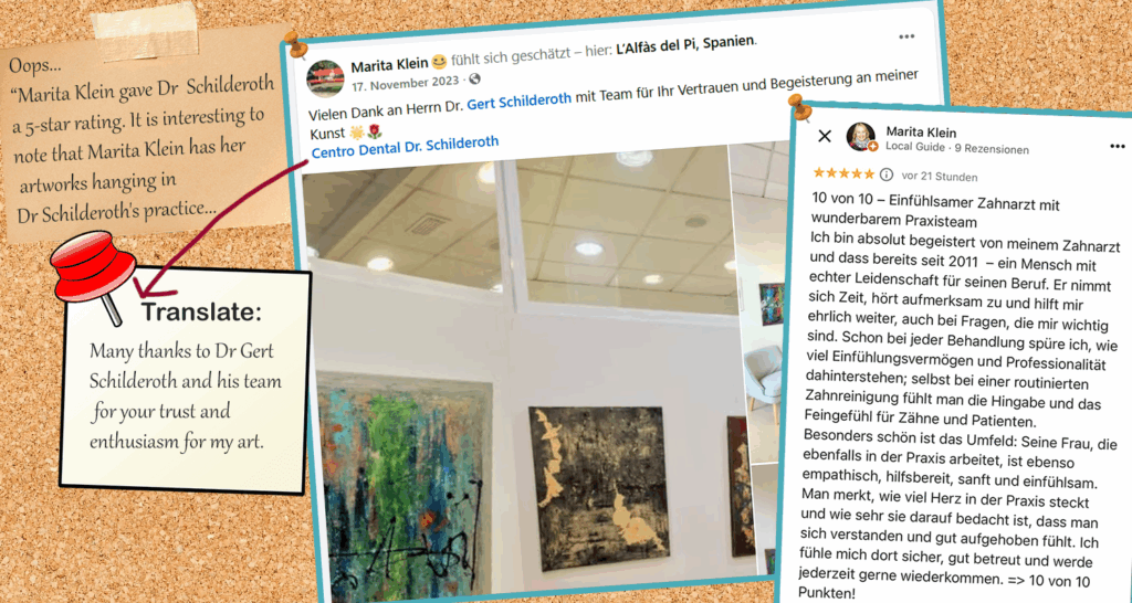 Later, I found other former patients who also said he had over-ground their teeth, but these reports were repeatedly removed. Around that time, several new positive Google reviews suddenly appeared from accounts that seemed to have been created solely to praise him, including one from a “Marita Klein,” an artist whose paintings hang in his clinic and who appears to be a friend of Gert and Conny Schilderoth. Whether her review is truly independent is for others to decide.